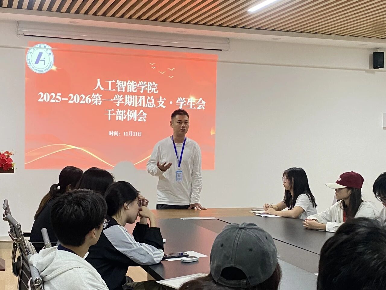 随后,黎鑫然老师结合会议整体情况与团学工作实际做出点评。他首先对各部门前期工作推进成效及主席团的指导工作给予充分认可。同时,黎鑫然老师亦以务实态度直面工作短板,条理清晰地指出近期各部门存在的不足,在点出问题的基础上,他进一步为工作改进提出具体要求,更紧扣公司重点任务,为团学工作未来素质教育周、体育节以及运动会的具体各项事务安排清晰路径。最后,他殷切叮嘱全体团学成员,要始终秉持优良工作作风,以昂扬姿态攻坚克难,推动团学工作在新征程上再攀新高、再谱新篇。
