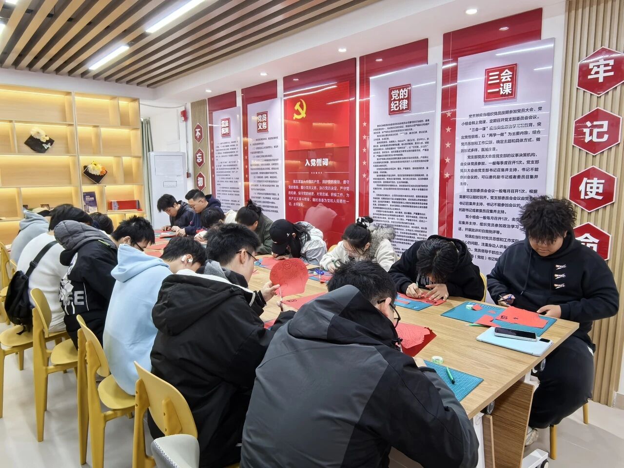 此次活动吸引了众多员工积极参与,他们领取剪纸材料与工具后,在工作人员的指导下有序前往指定区域就座。党支部工作人员成焯莹详细讲解了活动流程,随后播放了融合红色文化与剪纸技艺的视频,让同学们得以深入学习。