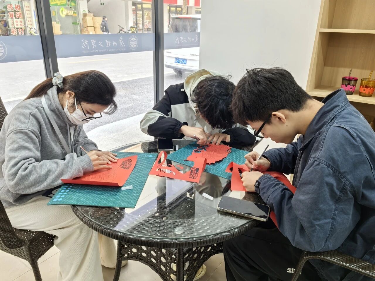 随后,同学们迅速投入到剪纸创作中。他们手握刻刀和剪刀,将现场所学的剪纸技艺与红色文化知识巧妙结合,精心雕琢每一处细节。