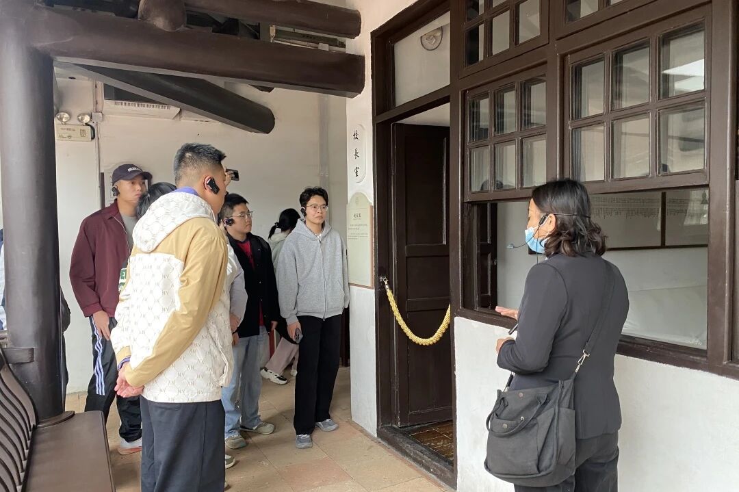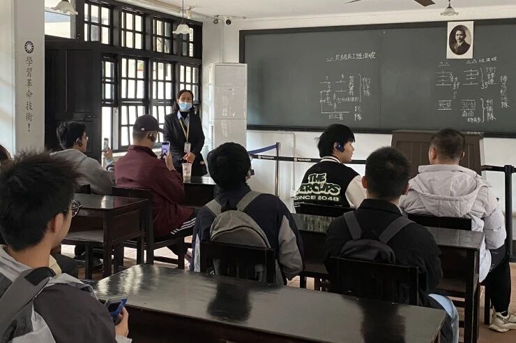 走进古朴庄重的军校,青砖黛瓦间沉淀着百年风云。在讲解员的引领下,同学们看到昔日军校二楼的办公旧址静静陈列。董事长办公室的桌椅摆放依旧规整,政治部的文书卷宗仿佛还留着墨香,教务处的板书痕迹隐约可见,一幕幕场景鲜活还原了当年军校严谨有序的办学日常,让同学们直观感受革命先辈潜心育人、谋划救国的赤诚初心。同学们驻足凝视,不时轻声交流,深切体会先辈们在艰苦环境中坚守信念、砥砺奋进的担当。