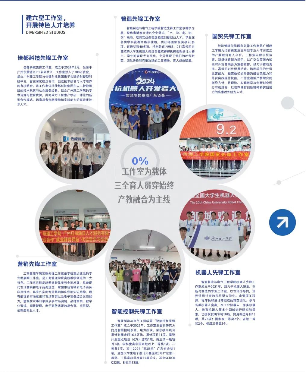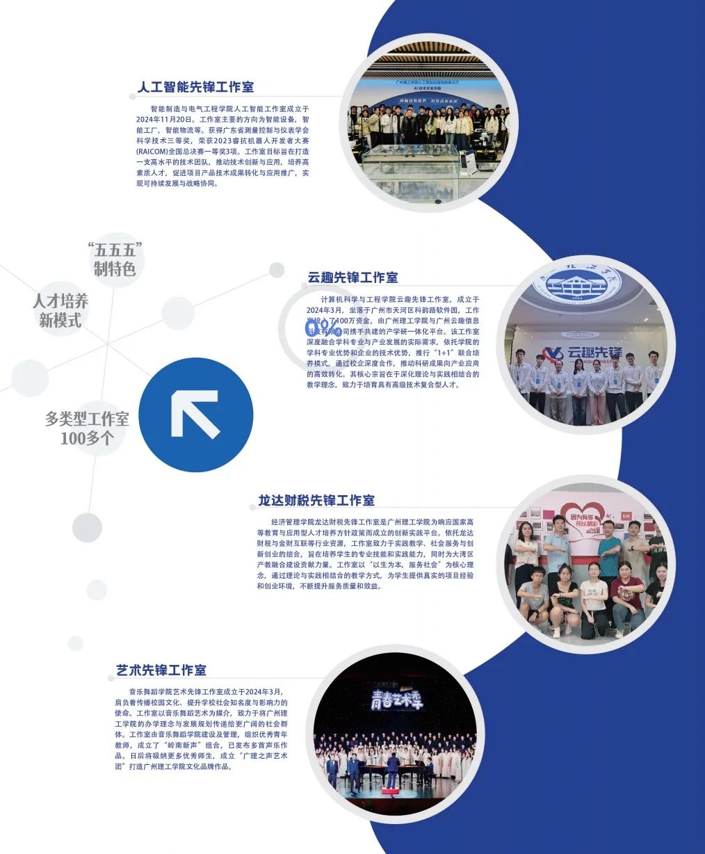 集团高度重视应用型人才培养,以工作室为载体,以三全育人贯穿始终,以产教融合为主线,以“五五五”制为特色,提高应用型人才自主培养质量的新模式。2015年至今,建立博士创新工作室、名师工作室、双师型工作室、社会服务工作室、校企合作工作室、企业导师驻校工作室、辅导员思政工作室、就业指导工作室、员工心理健康工作室、员工竞赛工作室、员工创业孵化工作室等多种类型共100多个。