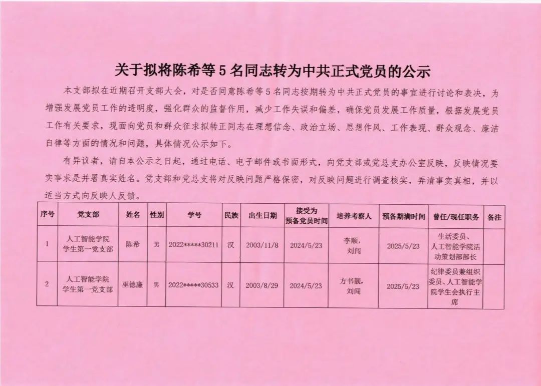 本支部拟在近期召开支部大会,对是否同意陈希等5名同志按期转为中共正式党员的事宜进行讨论和表决,为增强发展党员工作的透明度,强化群众的监督作用,减少工作失误和偏差,确保党员发展工作质量,根据发展党员工作有关要求,现面向党员和群众征求拟转正同志在理想信念、政治立场、思想作风、工作表现、群众观念、廉洁自律等方面的情况和问题,具体情况公示如下。