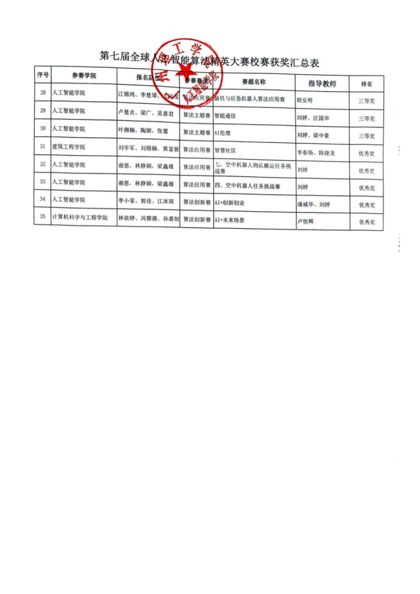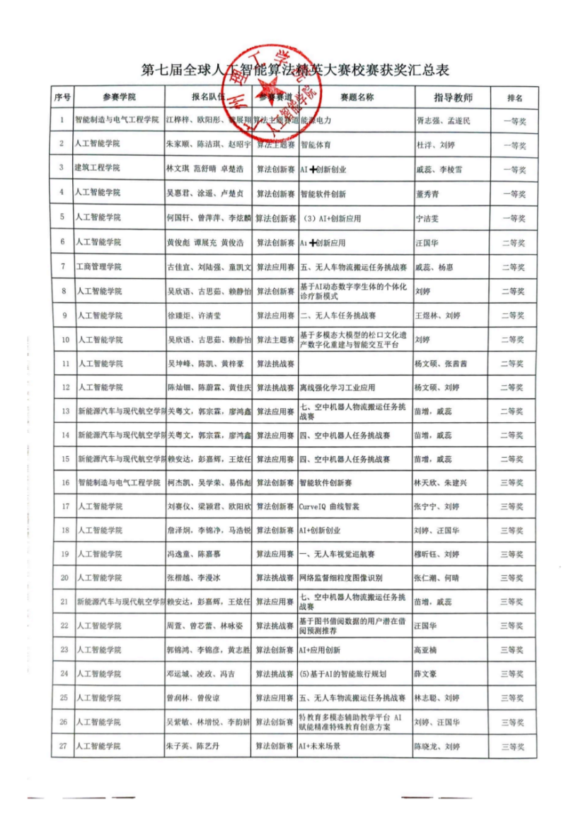 根据第七届全球校园人工智能算法精英大赛校赛组织程序,经参赛团队现场演示、评委评审等环节,现将校赛评选结果予以公示。